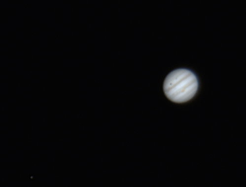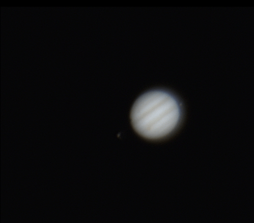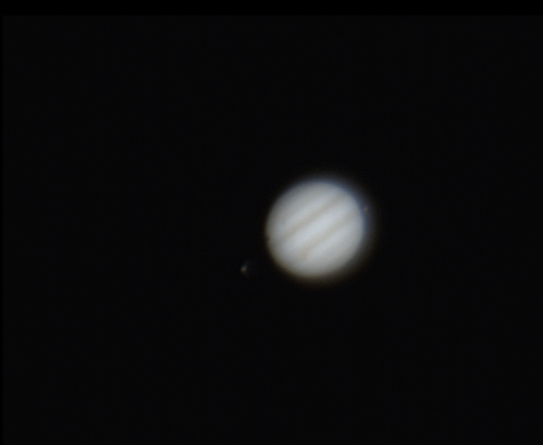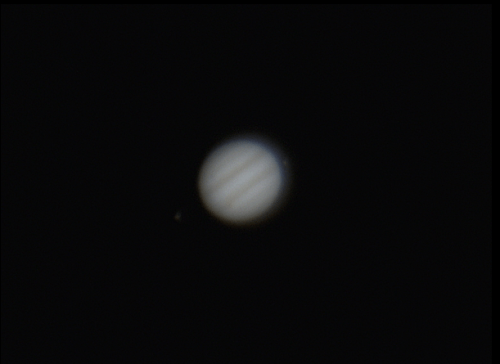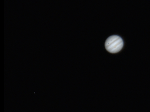 Es ist recht windig, das Teleskop wackelt ein wenig und das Bild ist daher etwas unscharf. Trotzdem kann man erkennen, dass Europa hinter Jupiter verschwunden ist.