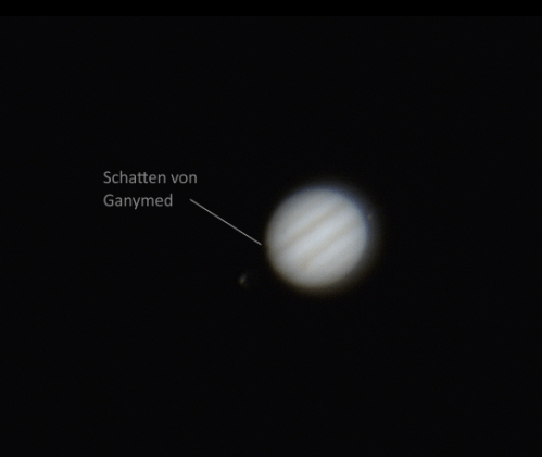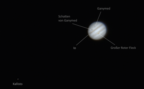 Die beiden Punkte oberhalb des oberen Bandes sind der Mond Ganymed und sein Schatten. Ganz am linken Rand dieses Bandes ist gerade der innerste Mond Io vor Jupiter getreten. Weit entfernt unten links erkennt man den äußersten Galileischen Mond Kallisto.