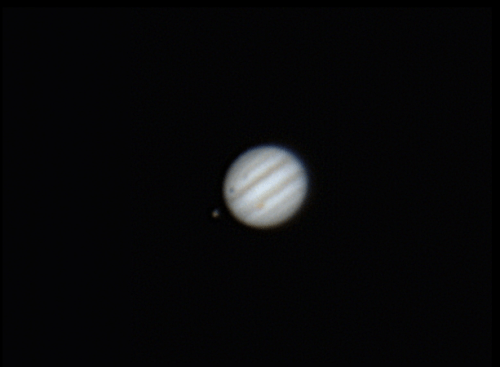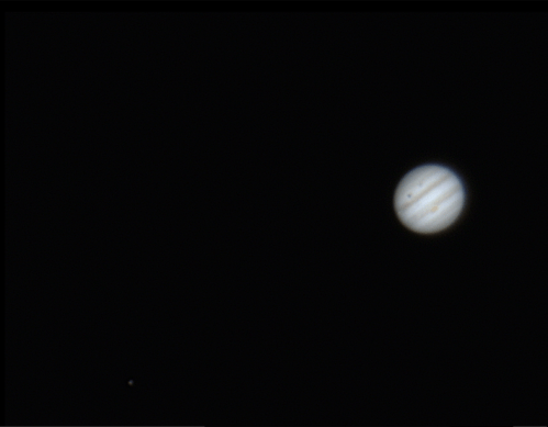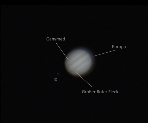Auf diesem Bild ist noch der Mond Europa zu erkennen, der um 21:03 Uhr hinter Jupiter verschwindet. Io ist hier noch relativ weit entfernt und Kallisto ist nicht zu erkennen, weil er zu lichtschwach ist. Der Große Rote Fleck und Ganymed sind nur zu erahnen.