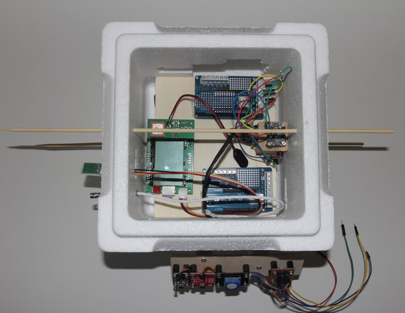 Ein wichtiger Bestandteil der Sensorerfassung ist der Strato 3. Der Strato 3 ist ein fertig programmierter Mikrocontroller zur Erfassung von Messwerten, den wir bei der Fa. Stratoflights bestellt haben. Die Daten werden über eine auf der Außenseite der Nutzlast liegende Sensorplatine erfasst. Zur Darstellung der Daten ist ein Display über der Hauptplatine montiert, das live den Status des GPS-Sensors und die Messdaten anzeigt. Dieses Display ist vor allem für die Tests vor dem Start interessant, aber beim späteren Flug ist die Speicherung auf einer Micro SD-Karte in Tabellenform nützlich. Die Stromversorgung wird über eine Lithium-9Volt-Batterie sichergestellt. Folgende Daten werden dabei gemessen: