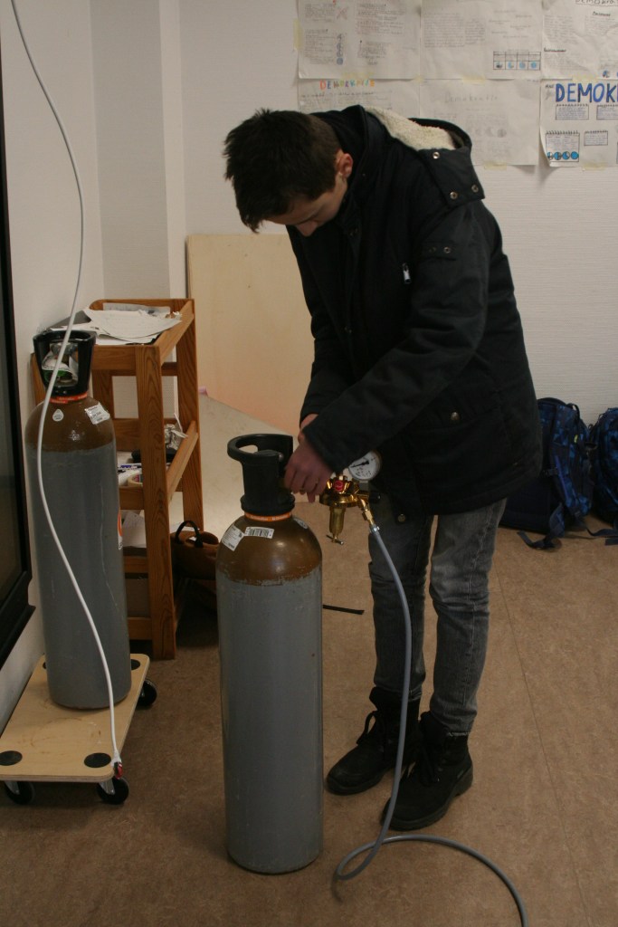 Die Befüllung bzw. die Bedienung des Gas-Ventils wurde von Moritz übernommen, welcher auch darauf geachtet hat, wie viel Gas noch in den Ballon muss. Da der Ballon bei der Befüllung immer mehr an Zugkraft dazugewonnen hat, musste das Festhalten von Herrn Grashof übernommen werden.