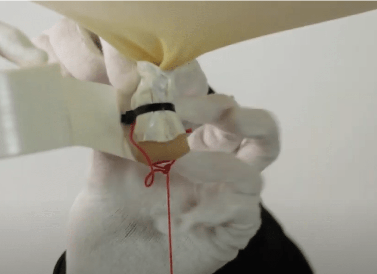 - Die Öffnung wurde oben und unten am Ballonventil mit einem Kabelbinder festgezurrt. Damit dieser dann nicht gefährliche Einschnitte in die Ballonhaut verursacht, musste dieser mit Klebeband abgeklebt werden.